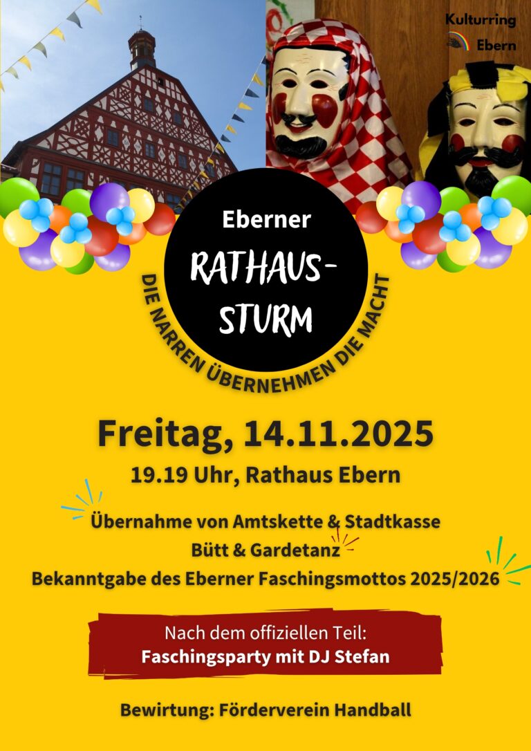 Am 14.11.2025 starten die Närrinnen und Narren in Ebern wieder in die fünfte Jahreszeit. Der Kulturring Ebern lädt dann zum traditionellen Faschingsauftakt in die Eberner