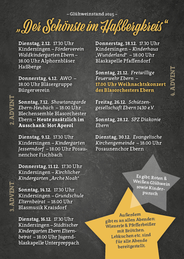 Der Kulturring Ebern lädt in diesem Jahr zum 20. Glühweintreff auf den Eberner Marktplatz ein. Am 02., 04., 07., 09., 11., 14., 16., 18., 21., 26., 28., sowie 30. Dezember gibt es jeweils von 17 bis 20 Uhr die Möglichkeit, bei handgemachter vorweihnachtlicher Musik, Glühwein, Kerzenschein und netten Gesprächen auf dem Eberner Marktplatz zu verweilen. Das detaillierte Programm finden Sie weiter unten.
